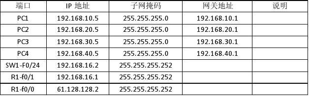 某實驗室的網絡拓撲結構如圖3-1所示,內部網有4個部門,要求相互之間不能通過網上鄰居訪問,但可以通過IP 地址相互訪問,SW1為三層交換機。內部網全部使用IP 地址?,F有一個互聯網固定地址(61.128.128.2/30),要求實現所有內部網計算機能夠訪問互聯網。