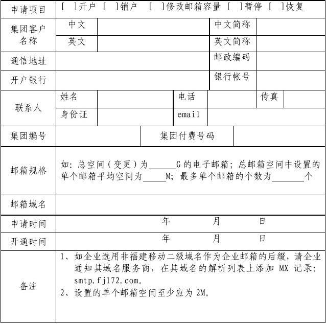 福建移動通信有限責任公司企業(yè)郵箱業(yè)務(wù)申請單受理人: 用戶簽字(單位蓋章):受理日期: 年 月 日