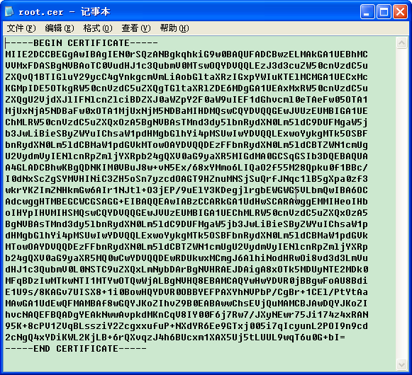 A.分別使用文本編輯工具(如notepad)將root.cer 和CNNIC.cer 分別打開,分別顯示如下所示