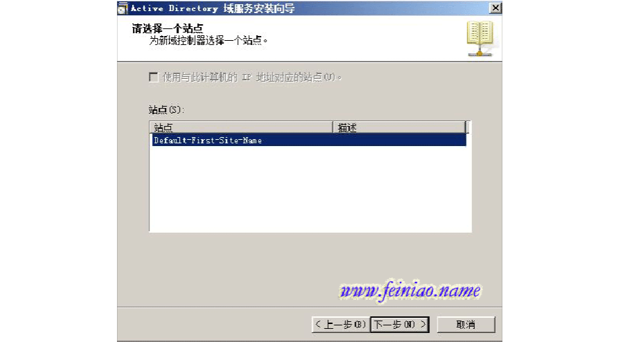 出現(xiàn)為新域控制器選擇一個(gè)站點(diǎn),我這里就使用默認(rèn)站點(diǎn),直接”下一步“,