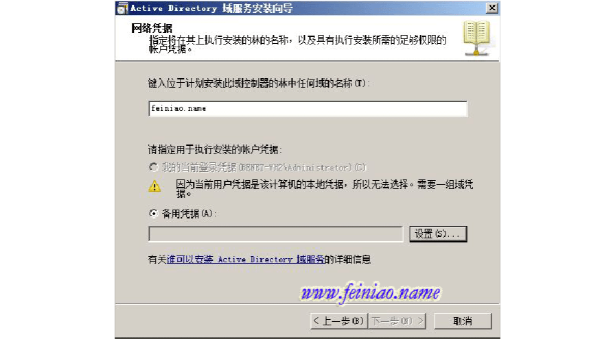 之后需要設(shè)置網(wǎng)絡(luò)憑據(jù),也就是需要輸入第一臺(tái)域控制器的域名,并且在“備用憑據(jù)“處點(diǎn)擊”設(shè)置