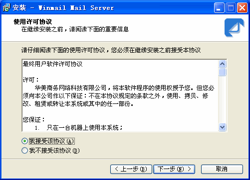 4) 閱讀 Winmail Server 的使用許可,同意后選擇“我接受該協(xié)議”,然后點擊“下一步”繼續(xù)安裝