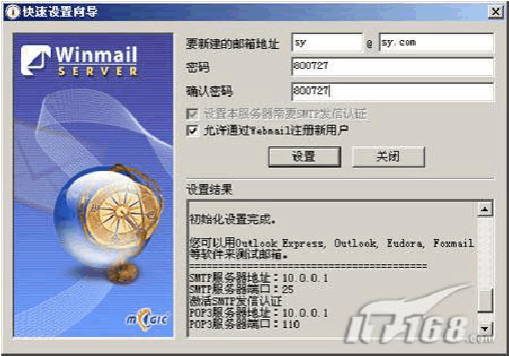 1. 快速設置向導。如下圖所示,首先輸入要新立的郵箱地址和使用密碼,然后點“設置”,設置向導會自動查找系統(tǒng)數據庫中是否存在要建的郵箱及域名,同時也會測試 POP3、SMTP 、HTTP 和ADMIN 服務器是否成功啟動;之后會在“設置結果”框內顯示測試信息和有關郵件客戶端的配置信息,也給出了WEB 管理地址。