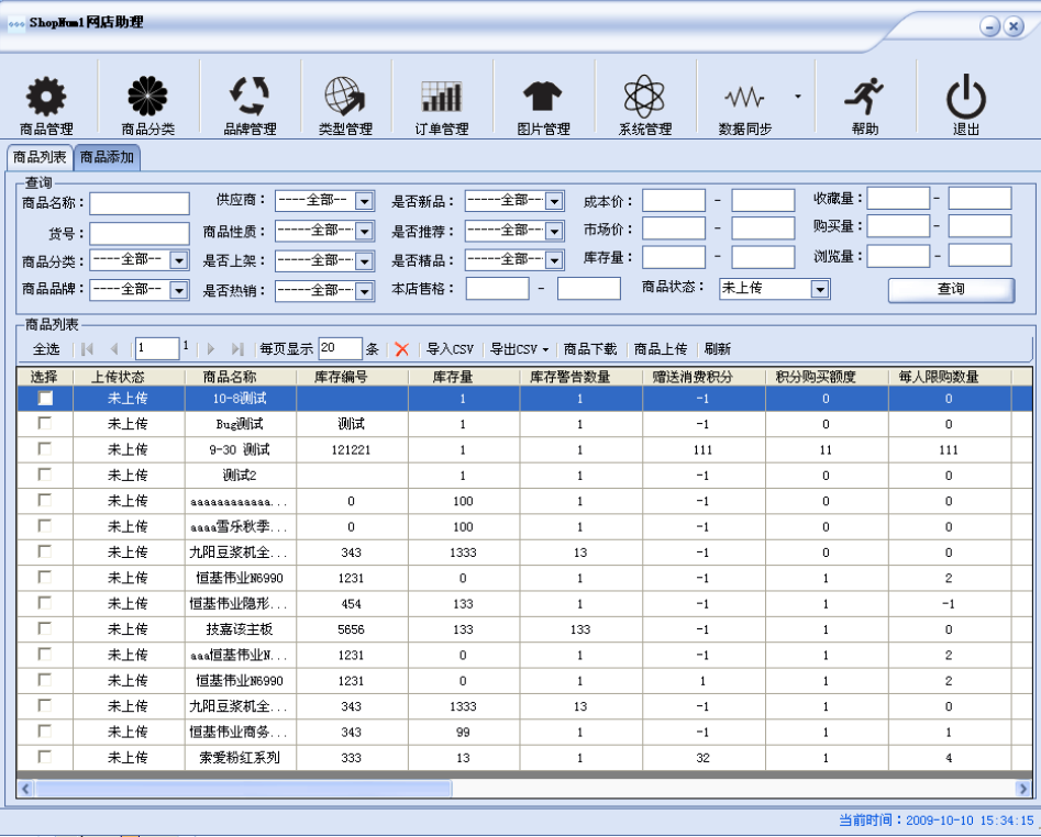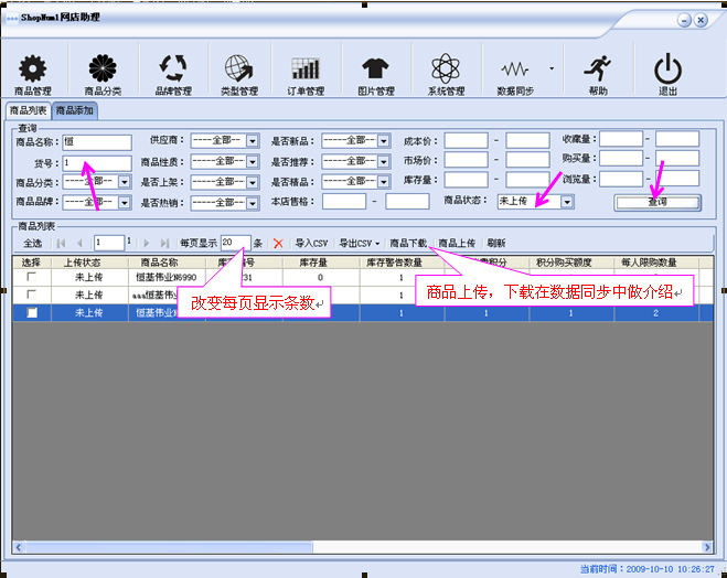 概述:本窗體是對整個網(wǎng)店的商品處理操作,包括查詢、增加商品(支持csv 數(shù)據(jù))、編輯商品(包括批量編輯)、刪除商品(包括批量刪除)、上傳商品至服務器以及下載服務器商品。
