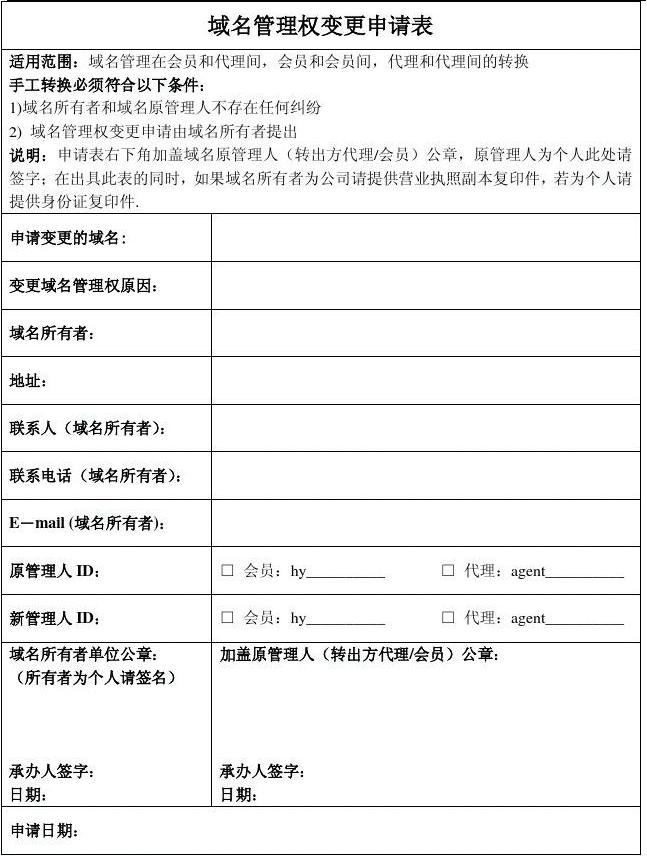 北京新網數(shù)碼信息技術有限公司注:1、需提供申請表原件;2、提交資料齊全后,新網將向域名管理人郵箱發(fā)送確認郵件,如有異議,管理人需在規(guī)定期限內回復郵件,新網收到拒絕變更通知后將暫停變更申請?zhí)幚?。如無異議