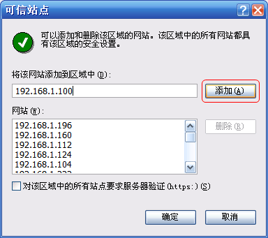 d) 將DVR 的IP 添加到區(qū)域中:輸入IP ,點擊“添加”按鈕?!按_定”退出該對話框返回