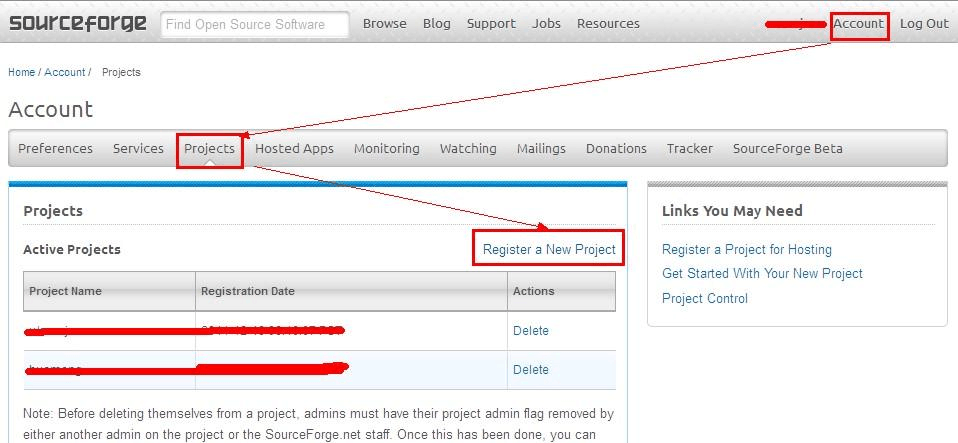 1. 使用注冊的賬號登陸后點擊右上角的Account 然后在新的頁面點擊Projects 即可看到新建項目的鏈接“Register a New Project”