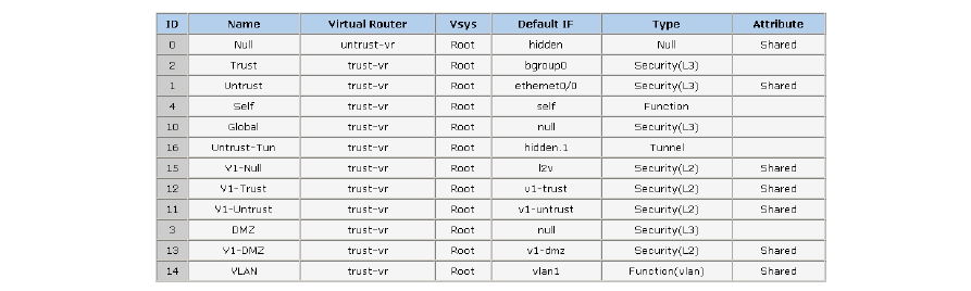 Trust 、Untrust 和 DMZ (用于第3 層操作) ,或者 V1-Trust、V1-Untrust 和 V1-DMZ ( 用于第2 層操作) 。