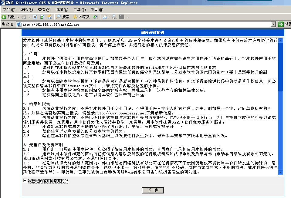 如:http://192.168.1.99/index.asp 出現(xiàn)安裝界面,同意協(xié)議,下一步。
