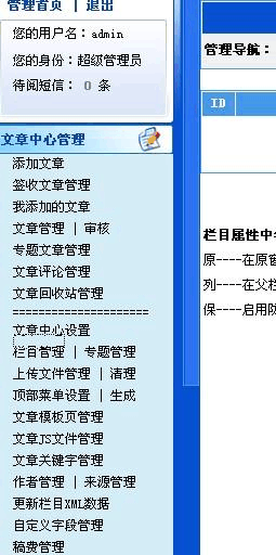 其中需要注意的是“添加文章”與“欄目管理”這兩個選項。