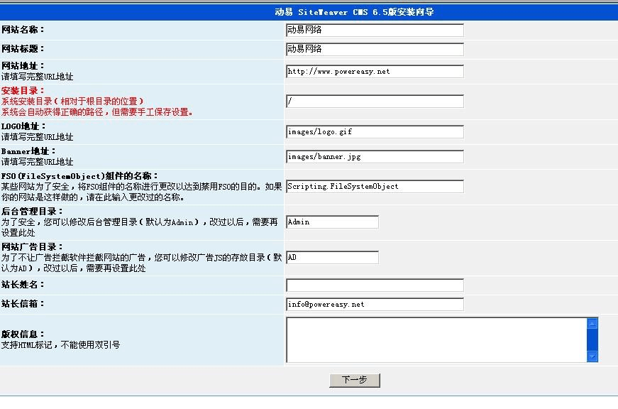 填寫相關(guān)信息,如網(wǎng)站標題,名稱等。注意網(wǎng)站地址必須正確填寫。 安裝