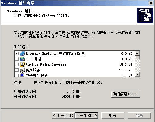 默認(rèn)情況下所有的網(wǎng)絡(luò)服務(wù)都會被添加,可以點(diǎn)擊下面的“詳細(xì)信息”進(jìn)行自定義安裝,由于在這里只需要DNS ,所以把其它的全都去掉了,以后需要的時候再安裝: