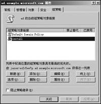 “AD.EXAMPLE.MICROSOFT.COM”上單擊右鍵,選擇 “屬性”,在彈出的對話框中點(diǎn)擊“組策略”選項(xiàng)卡(如圖1所示),列表中顯示的就是已經(jīng)設(shè)置好的策略,你可以在這些策略上修改,也可以新建一個(gè)。點(diǎn)擊“新建”,然后修改好名字如“install”,選中這個(gè)組策略按“編輯”按鈕,這時(shí)就進(jìn)入到我們熟悉的組策略設(shè)置窗口,這個(gè)組策略的設(shè)置跟單機(jī)上的組策略完全一樣,由于是給客戶機(jī)安裝軟件,那么現(xiàn)在就需要用到組策略中的登錄腳本來實(shí)現(xiàn)。不過在設(shè)置組策略之前,需要把腳本文件準(zhǔn)備好,打開記事本,輸入“start/wait
