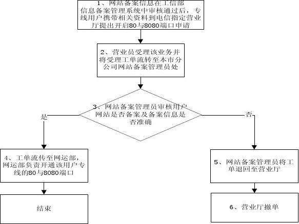 如貴公司有下掛網(wǎng)站需求,申請開放80和8080端口,需在工業(yè)和信息產(chǎn)業(yè)化部ICP/IP地址/域名信息備案管理系統(tǒng)先完成網(wǎng)站備案、真實性核驗并審核通過的情況下,持網(wǎng)站主辦單位簽署的我公司提供的《備案信息確認(rèn)函》(附件二)至1209室二次核驗,核驗完成后,在指定營業(yè)廳受理,我公司在2個工作日內(nèi)開放80和8080端口。具體流程如下: