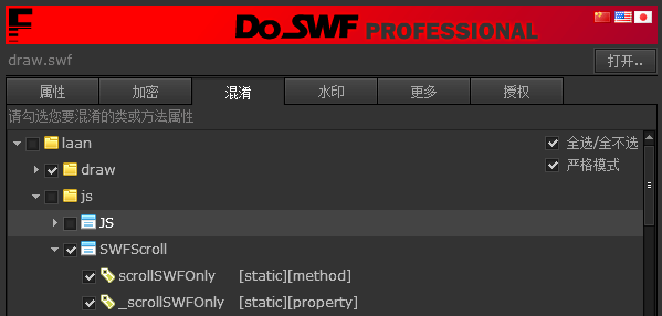 根據(jù)目標(biāo)SWF 文件不一樣,可選擇是否使用嚴(yán)格模式,以便達(dá)到更優(yōu)的加密效果。