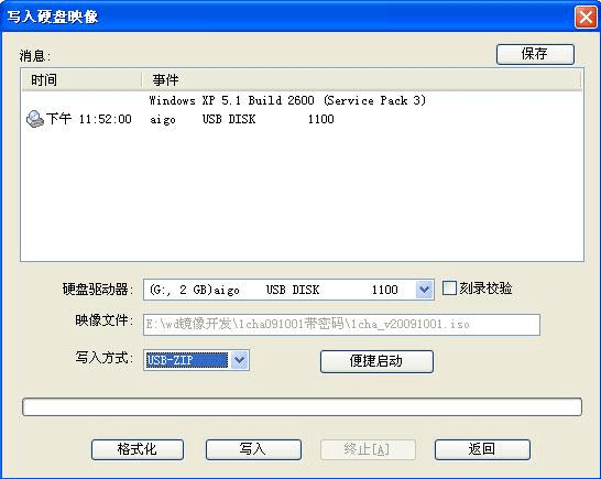 (3)根據(jù)主板支持情況,可選usb-zip,usb-hdd,usb-zip ,usb-hdd 四種模式中的一種,選寫入生成安裝盤。