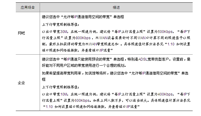 例如運(yùn)營商帶寬為10Mbps ,帶機(jī)量100臺PC ,80的帶寬就是8Mbps ,20的人就是20個人,那么8Mbps*1000=8000kbps(實(shí)際上應(yīng)該乘以1024,這里簡單以1000計算),8000kbps/20=400kbps,則理論值為每IP 需要下行限速400kbps ,上行值為200~300kbps ,當(dāng)然該計算值是理論值,需要根據(jù)實(shí)際的網(wǎng)絡(luò)使用量來適當(dāng)變化。如果是ADSL 寬帶類型客戶,則上行帶寬建議限制為100kbps ,且不推薦允許每IP 通道借用空閑的帶寬。如果企業(yè)、酒店等環(huán)境,平時使用網(wǎng)絡(luò)的時間或者占用的流量不是很大,那么可以適當(dāng)將限速值調(diào)高,如下行600kbps ,上行400kbps ,并開啟允許每IP 通道借用空閑的帶寬。如網(wǎng)吧環(huán)境,帶寬使用量較大,則需要增加帶寬或者較少帶機(jī)量來提高客戶網(wǎng)速的體驗(yàn),保證游戲和視頻的正常工作。網(wǎng)吧一般建議每IP 限速下行800kbps ,上行500kbps ,開啟彈性帶寬功能,即允許每IP 通道借用空閑的帶寬。雙WAN 設(shè)備需要針對不同WAN 口計算不同的限速值予以限制,最終主機(jī)獲得的帶寬為雙WAN 帶寬限速總和。